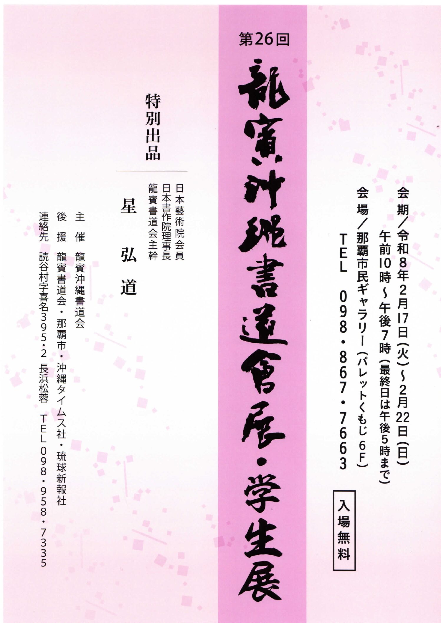 那覇市民ギャラリー naha civic gallery ギャラリーの 利用について ご利用前のご案内や申請の流れなど申請に必要な情報をご案内しております ギャラリーの 空き状況 空き状況の反映には時間を要しますので、最新の状況は電話でお問合せください お知らせ information 一覧を見る 2026年01月27日 2026年8月(8/3~9/6)の利用申請について 詳しく見る 2026年01月24日 ギャラリー空き状況【1月24日更新】 詳しく見る 2026年01月13日 現在の受付【1月13日更新】 詳しく見る 2025年12月25日 2月催物案内 詳しく見る 2026年01月29日 3月催物案内 詳しく見る 催し物案内 events 一覧を見る 2025年02月03日 第48回沖縄県書作家協会 木筆會書道展 詳しく見る 2025年02月10日 第7回 BB 作品展 詳しく見る 2025年02月10日 第22回沖縄県写真協会会員作品展 詳しく見る 2025年02月11日 AMAMIへ 詳しく見る 2025年02月17日 第26回龍賓沖縄書道会展・学生展 詳しく見る palette civic theater
