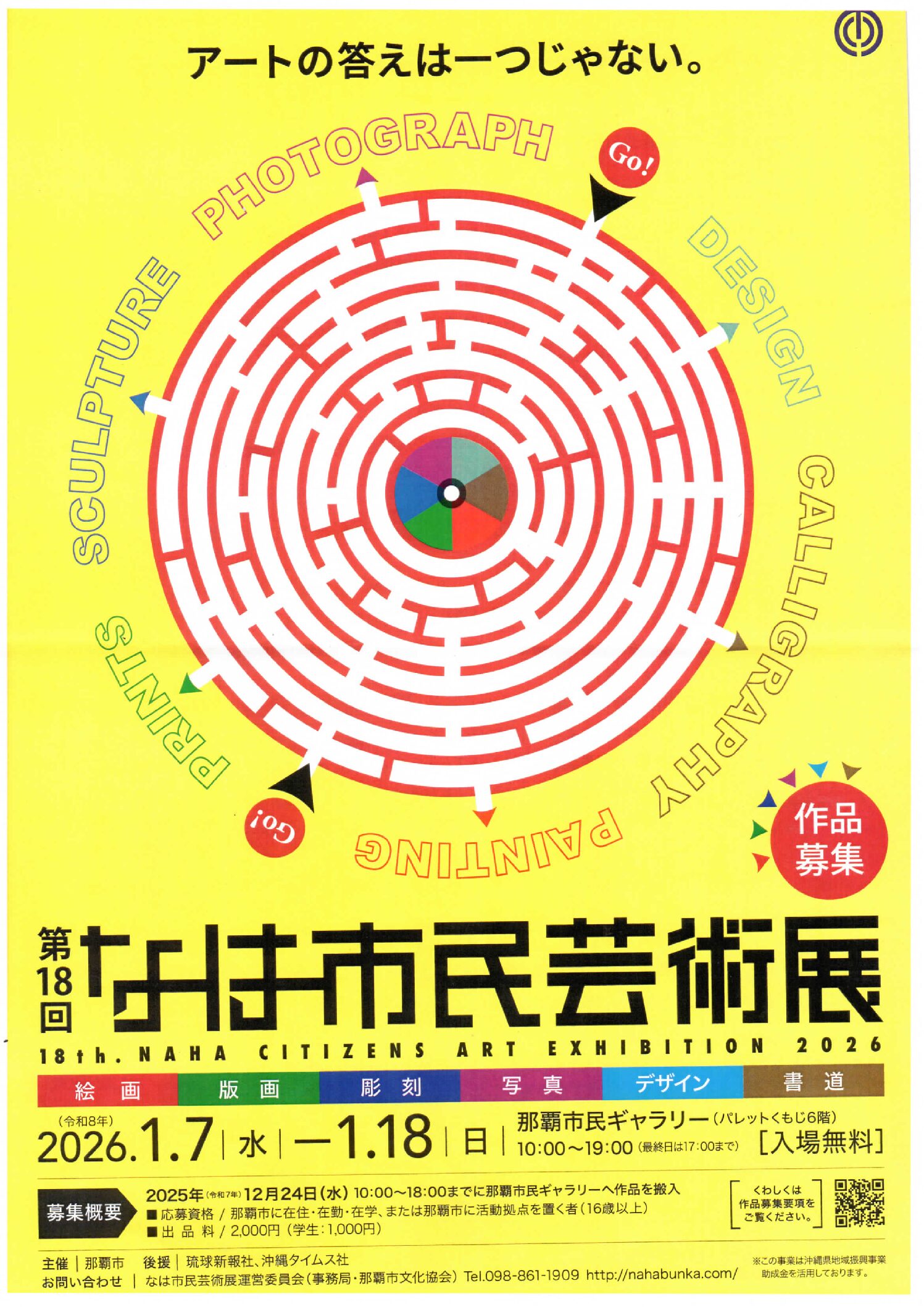 那覇市民ギャラリー naha civic gallery ギャラリーの 利用について ご利用前のご案内や申請の流れなど申請に必要な情報をご案内しております ギャラリーの 空き状況 空き状況の反映には時間を要しますので、最新の状況は電話でお問合せください お知らせ information 一覧を見る 2025年11月20日 2026年6月(6/1~7/5)の利用申請について 詳しく見る 2025年12月02日 ギャラリー空き状況【12月2日更新】 詳しく見る 2025年11月20日 現在の受付 詳しく見る 2025年10月31日 12月催物案内 詳しく見る 2025年12月02日 1月催物案内 詳しく見る 催し物案内 events 一覧を見る 2025年12月02日 彫刻の五七五 ーかたちで詠む沖縄の春夏秋冬ー 詳しく見る 2025年12月09日 難病の子どもと家族のための医療ケア付キャンプ場 … 詳しく見る 2026年01月07日 第18回なは市民芸術展 詳しく見る 2026年01月27日 第66回沖縄県立首里高等学校染織デザイン科卒業作品… 詳しく見る 2026年01月27日 Atmosphere2 ゆらゆいゆい 同窓グルー… 詳しく見る palette civic theater