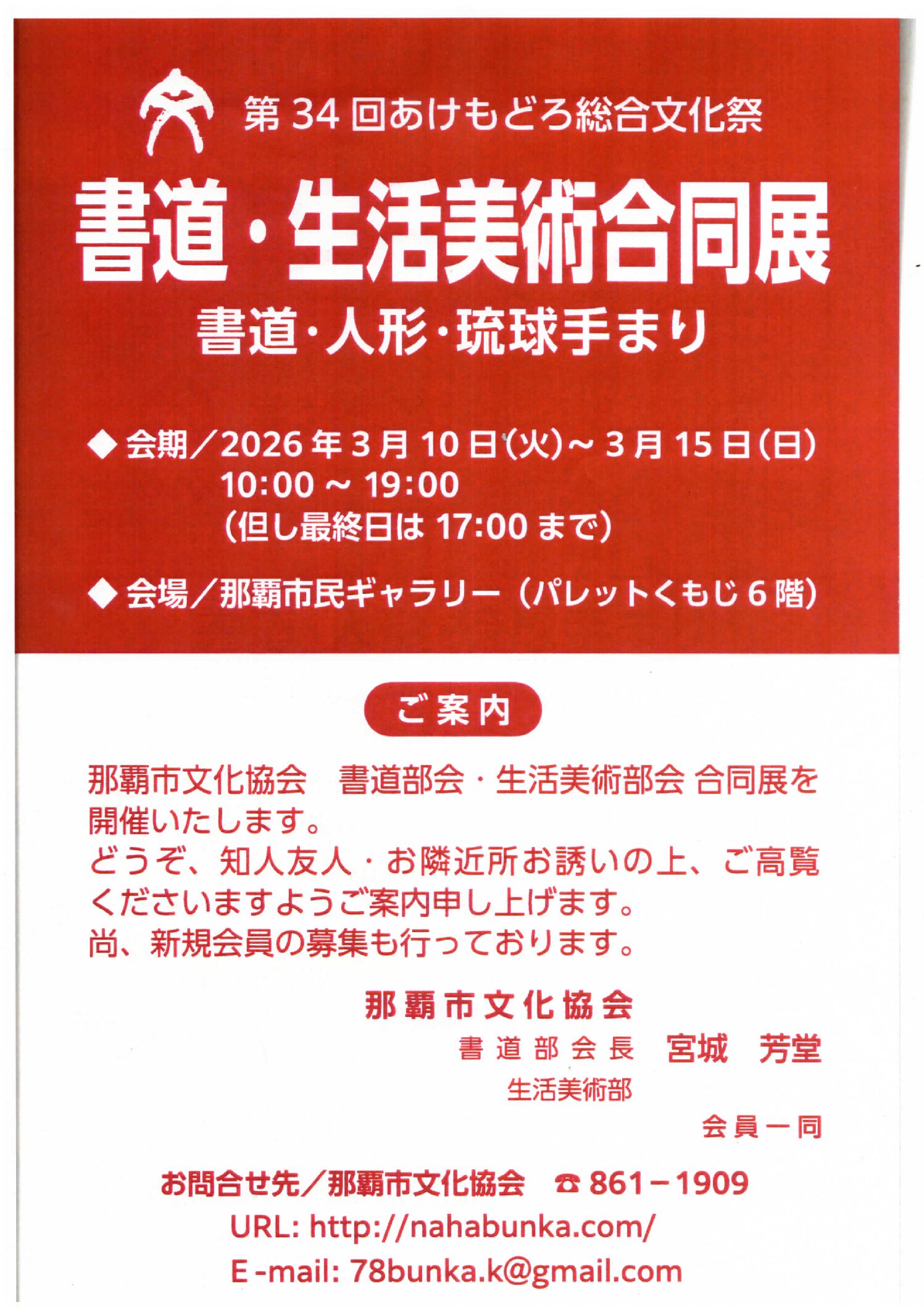 那覇市民ギャラリー naha civic gallery ギャラリーの 利用について ご利用前のご案内や申請の流れなど申請に必要な情報をご案内しております ギャラリーの 空き状況 空き状況の反映には時間を要しますので、最新の状況は電話でお問合せください お知らせ information 一覧を見る 2026年02月24日 ギャラリー空き状況【2月24日更新】 詳しく見る 2026年02月24日 2026年9月(9/7~10/4)の利用申請につい… 詳しく見る 2026年02月12日 現在の受付【2月12日更新】 詳しく見る 2025年12月25日 2月催物案内 詳しく見る 2026年01月29日 3月催物案内 詳しく見る 催し物案内 events 一覧を見る 2026年02月24日 阿磨球摩 写真展 詳しく見る 2026年02月24日 沖縄写真デザイン学校 沖縄写真デザイン工芸学校 … 詳しく見る 2026年02月24日 沖縄写真デザイン学校 第13期生卒業制作作品展 詳しく見る 2026年03月03日 第34回あけもどろ総合文化祭 写真・美術工芸合同展 詳しく見る 2026年03月10日 第34回あけもどろ総合文化祭 書道・生活美術合同展 詳しく見る palette civic theater