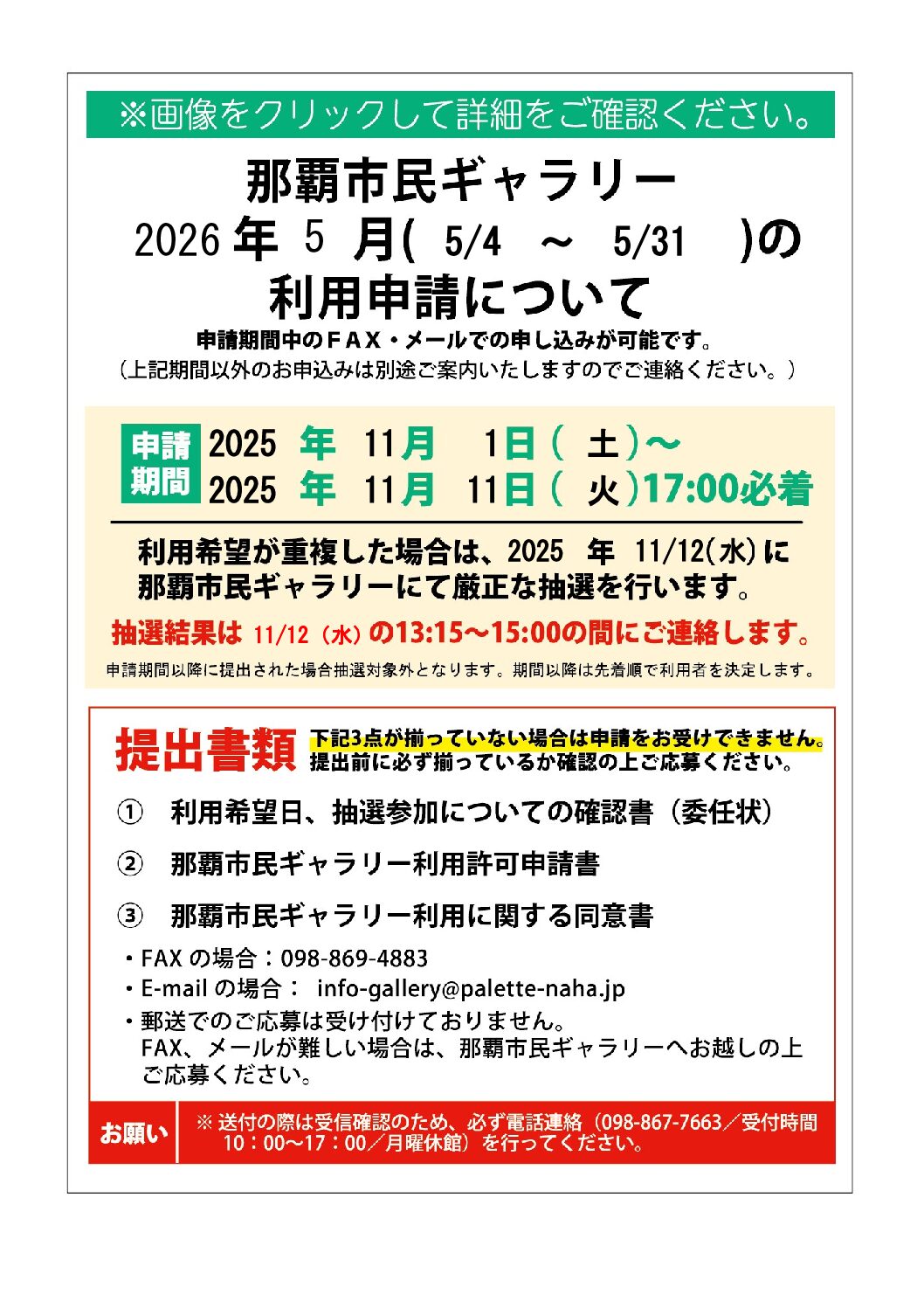 お知らせ information 2025年11月20日 2026年6月(6/1~7/5)の利用申請について 詳しく見る 2025年11月13日 ギャラリー空き状況【11月13日更新】 詳しく見る 2025年11月20日 現在の受付 詳しく見る 2025年10月21日 11月催物案内 詳しく見る 2025年10月31日 12月催物案内 詳しく見る 2025年04月01日 那覇市民ギャラリー来館時のお願い 詳しく見る