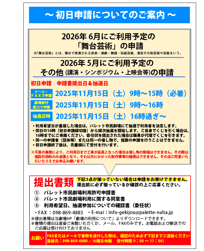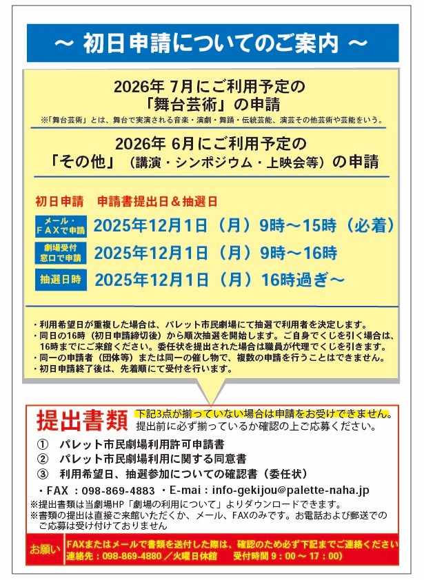 パレット市民劇場 palette civic theater 劇場の 利用について ご利用前のご案内や申請の流れなど申請に必要な情報をご案内しております 劇場の 空き状況 空き状況の反映には時間を要しますので、最新の状況は電話でお問合せください お知らせ information 一覧を見る 2025年11月15日 劇場空き状況 詳しく見る 2025年11月08日 【11/15受付】2026年6月(舞台芸術)・5月… 詳しく見る 2025年10月17日 予約申請再開について 詳しく見る 2024年03月15日 【重要】休館のお知らせ 詳しく見る 催し物案内 events 一覧を見る 2025年04月01日 令和7年4月~令和8年3月までは休館します。 詳しく見る naha civic gallery