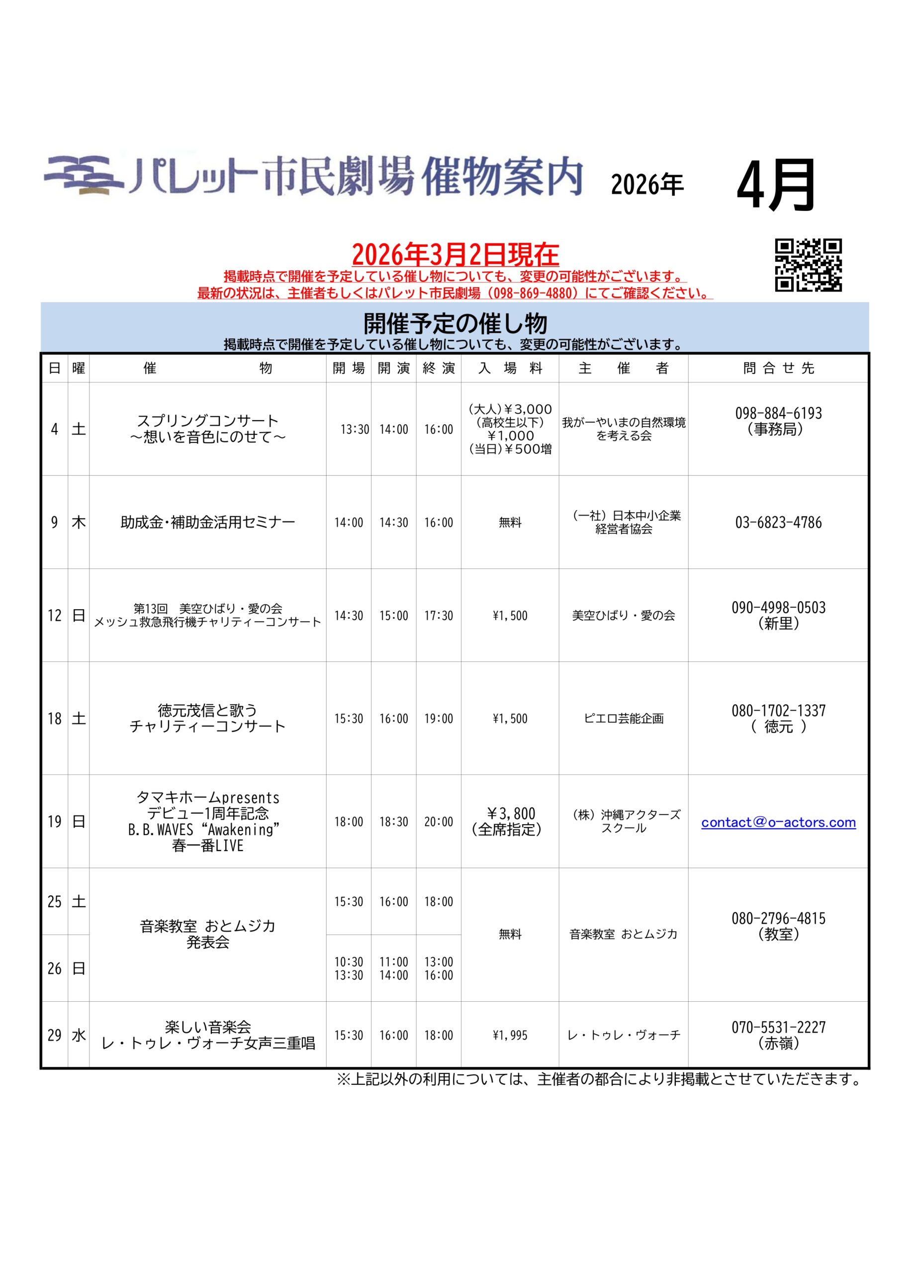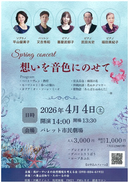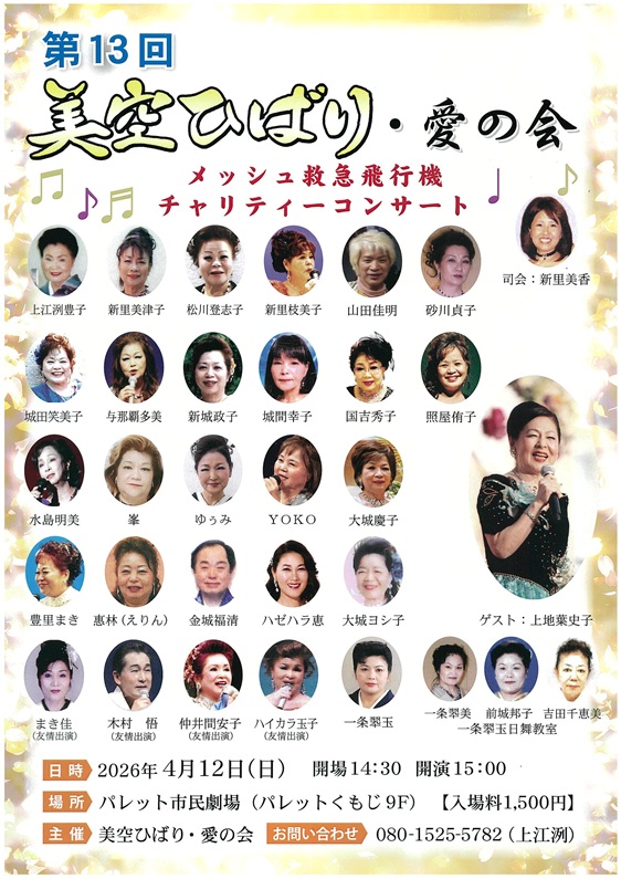 イベント情報 events 今月のイベント一覧はこちら 来月のイベント一覧はこちら 2026年04月04日 第11回 音楽教室 おとムジカ発表会 詳しく見る 2026年04月01日 第13回 美空ひばり愛の会 メッシュ救急飛行機 チ… 詳しく見る 2026年03月29日 【4月のイベント情報】 詳しく見る 2026年03月27日 我がーやいまの自然環境を考える会 Spring C… 詳しく見る